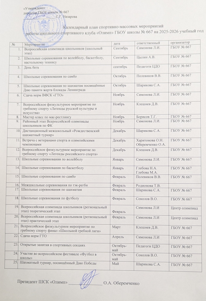 КАЛЕНДАРНЫЙ ПЛАН СПОРТИВНО-МАССОВЫХ МЕРОПРИЯТИЙ ШСК "ОЛИМП"