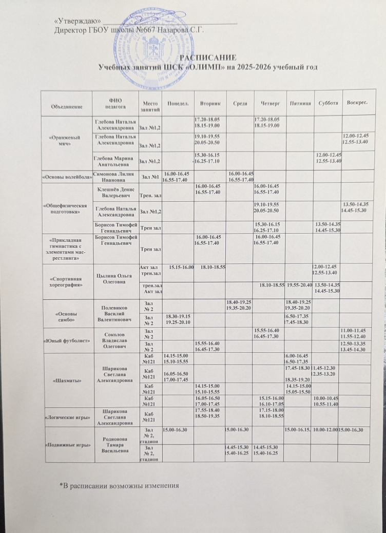 РАСПИСАНИЕ ЗАНЯТИЙ УЧЕБНЫХ ГРУПП ШСК "ОЛИМП" 2025-2026 г.